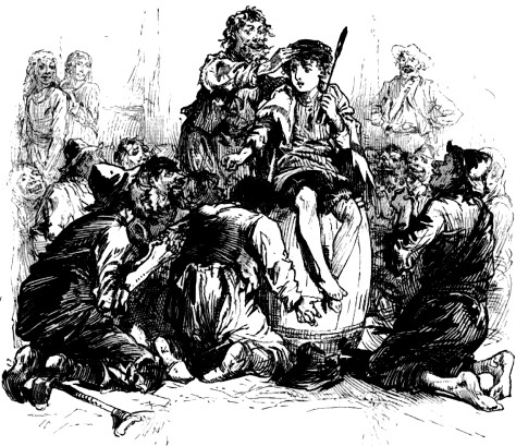 Он видит в окно дворца «толпу мужчин, женщин и детей беднейшего сословия, которые со свистом и гиканьем бежали по дороге». По его желанию узнают и сообщают, что эта толпа следует за мужчиной, женщиной и девочкой, которых ведут на казнь. «Смерть, лютая смерть ожидает троих несчастных! В сердце Тома словно что-то оборвалось. Жалость овладела им и вытеснила все прочие чувства; он не подумал о нарушениях закона, об ущербе и муках, которые эти преступники причинили своим жертвам, он не мог думать ни о чем, кроме виселицы... От волнения он даже забыл на минуту, что он не настоящий король, а поддельный, и прежде чем он успел подумать, у него вырвалось из уст приказание: