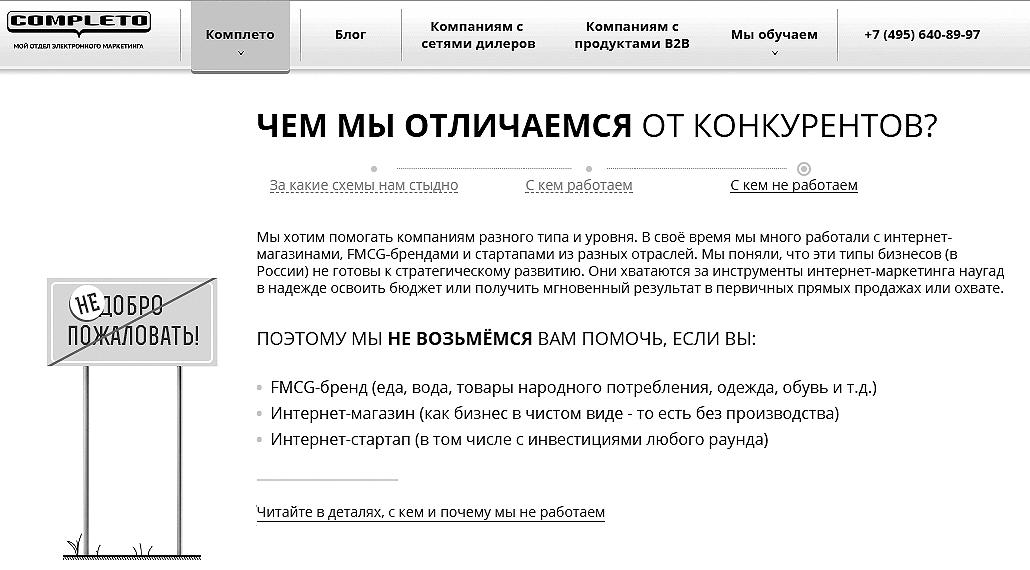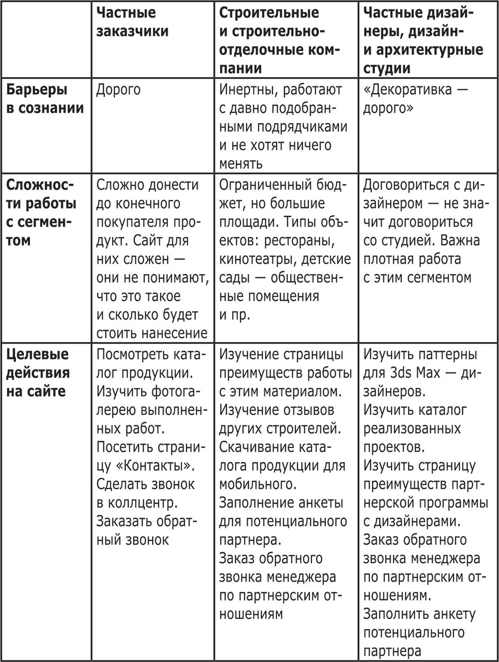 Необходимо такие сегменты «отсекать» на этапах пути клиента (привлечение, вовлечение и конвертация), чтобы они не добирались до вашего отдела продаж и не тратили время ваших специалистов. Про путь клиента и его этапы мы поговорим в отдельной главе, но вкратце идея заключается в том, чтобы реклама никак не касалась ненужной вам аудитории, а на сайте был контент, который чётко бы доносил позицию компании о том, с какими сегментами вы работаете, а кому не сможете помочь.