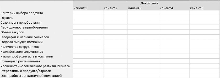 Дальше проходимся по каждому клиенту и заполняем каждую ячейку. Как в примере. Не только для Довольных клиентов, но и для Сложных, Потенциальных, Тех кто к нам даже не обращался