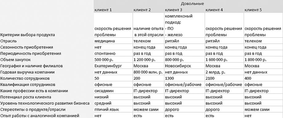Составляем таблицу в Excel и в левый столбик выписываем параметры сегментации целевой аудитории, которые у нас зафиксированы или которые мы можем получить с минимальными усилиями. А справа выписываем по блокам списки с довольными клиентами. В левом столбце обязательно сделать строчку «Критерии выбора продукта». Вспоминаем пример с медицинским оборудованием.