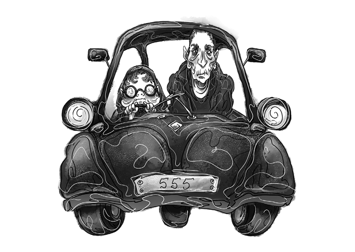 Рявкнул автомобильный глушитель, вернув её в настоящее. Машина даже похуже, чем старенький фиат Ким. Врана аккуратно свернула карту и уставилась в окно. Вверх по склону Цветочного Холма ковыляла чёрная как сажа трёхколёсная колымага. За рулём сидела старуха в тёмно-зелёном жакете. Волосы седые, на голове вязаный капор. На пассажирском сиденье мужчина. Под глазами чёрные мешки. Сам такой долговязый, что здоровенная макушка торчит из дырявой крыши машины. Перед домом 38 машина резко остановилась. Старуха посмотрела вверх, на Врану, и улыбнулась. Улыбнулся и мужчина — глаза чёрные, налитые кровью. Кожа у старушки была гладкая, как фарфор, и такая же белая, как и волосы. У мужчины с лица свисали складки кожи, будто нагар со свечи, — само лицо было таким же белым, как и у старушки. У Враны застучало сердце, она упала обратно на кровать. Медленно вдохнула, выдохнула. В Замогильнике ко многому придётся привыкать. Первые тени ночи уже царапались в окно, желудок у Враны забурчал погромче трёхколёсного автомобиля. Она на цыпочках спустилась вниз: в новом доме она всего несколько часов, ноги пока ни к чему не привыкли. Китти накрывала на стол.