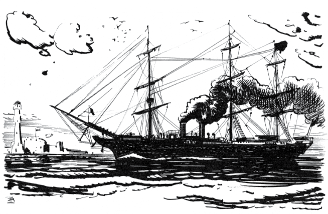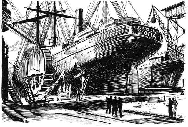 Многим известно имя знаменитого судостроителя англичанина Кюнарда. В 1840 году он основал почтовое сообщение между Ливерпулем и Галифаксом, для чего предназначены были три парохода, каждый в четыреста лошадиных сил, и одна яхта в тысячу сто шестьдесят две тонны водоизмещением. Спустя восемь лет деятельность компании значительно расширилась: она построила еще четыре парохода — каждый в шестьсот пятьдесят лошадиных сил и в тысячу восемьсот тонн водоизмещением, а спустя два года — еще два парохода со значительно превосходящим тоннажем. В 1852 году компания Кюнарда, получившая старинную привилегию на доставку депеш, вновь построила на своих верфях огромные пароходы: «Аравия», «Китай», «Шотландия», «Ява» и «Россия». Таким образом, в 1867 году компания располагала двенадцатью первоклассными пароходами, из которых восемь были колесные, а прочие четыре — винтовые.