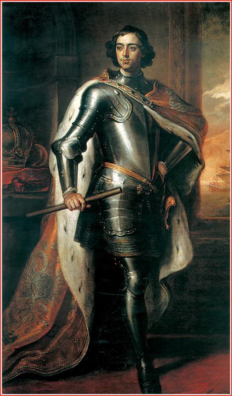 Чаще всего встречаются два портрета Петра. Один написан в 1698 г. в Англии, по желанию короля Вильгельма III, Кнеллером. Здесь Петр с длинными вьющимися волосами весело смотрит своими большими круглыми глазами. Несмотря на некоторую слащавость кисти, художнику, кажется, удалось поймать неуловимую веселую, даже почти насмешливую мину лица, напоминающую сохранившийся портрет бабушки Стрешневой. Другой портрет написан голландцем Карлом Моором в 1717 г., когда Петр ездил в Париж, чтобы ускорить окончание Северной войны и подготовить брак своей 8-летней дочери Елизаветы с 7-летним французским королем Людовиком XV.