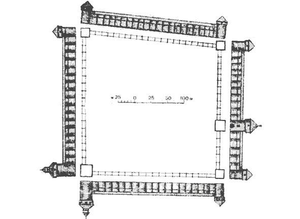 Одна башня с въездными воротами стояла на западной стороне в центре городской стены. Остальные четыре башни располагались по углам. Они не имели выхода наружу. В них были встроены по две бойницы с пищалями. Проезжая башня заложена на праздник Спаса. Так и назвали её Спасской. В этой башне (высота 8 метров) проделали 3 бойницы, 45 венцов (ряд брёвен, соединённых в единый деревянный сруб). На 32-м венце положили «обламок», выше уложили 13 широких венцов. Облам — это выступ на городской стене, через щели которого льют смолу и кидают камни на головы осаждающих. Под Спасской башней располагались наружные и внутренние ворота. Успенская, Ратиловская, Давыдовская и Зубцовская башни были высотой 5—6 метров. Успенской башня названа потому, что её строительство закончили к празднику Успения — 13 августа. Строительством Давыдовской башни руководил воевода Давыдов. Городская стена была установлена на гродни. Это такие толстые бревна с пазами. В пазы вставляли горизонтально бревна. С Зубцовской и Давыдовской башен вся река Таз была как на ладони. Ратиловская башня выходила к реке Ратиловке. Городские стены имели разную высоту — от 3 до 9 метров. Восточная стена (высота 3 м) выходила на реку Осетровку, западная стена — 9 метров, южная стена (6 метров) выходила на реку Таз. С башен просматривалась вся окрестность. Захватить Мангазею приступом и объехать летом было невозможно. К осени строительство города было завершено. Он получился небольшим по периметру — 281 метр. Однако мал золотник, да дорог. Город стоял на высоком берегу. Золоченые купола церквей сверкали на солнце.