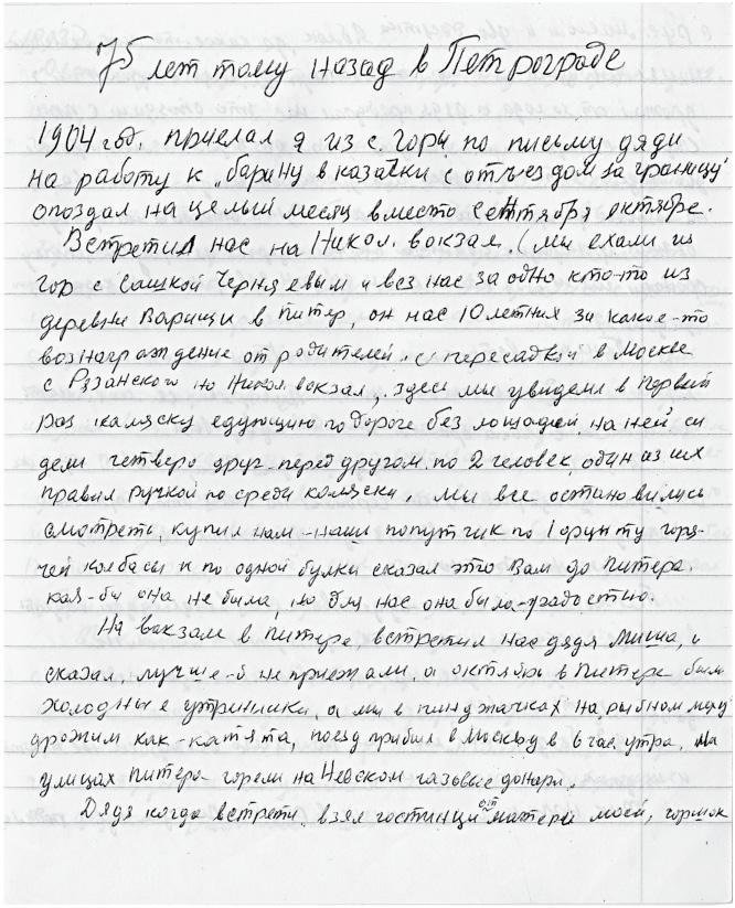 «В 1904 году приехал я в Санкт-Петербург из села Горы Коломенского уезда по письму своего дяди, чтобы устроиться на работу «к барину в казачки с отъездом за границу». Я опоздал на целый месяц, приехав вместо сентября в октябре. Мы ехали из села Горы с Сашкой Черняевым. Вез нас десятилетних в Питер «за одно» какой-то мужик из деревни Варищи, сговорившийся с родителями о вознаграждении.