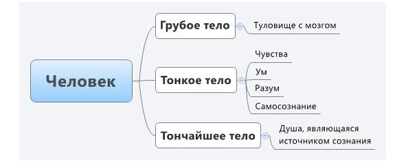 Если отбросить распространённую западную аксиому о том, что человек — это туловище с мозгом, то человек представляет из себя матрёшку, включающую в себя грубое тело (туловище с мозгом), тонкое тело (чувства, ум, разум, самосознание) и тончайшее тело (душа, являющаяся источником сознания). Все три тела соединяются друг с другом с помощью потоков жизненной силы (Праны), которая связывает их в определённых местах. По этой причине, воздействуя на грубое тело, можно влиять на тонкое и наоборот. Так, в традиционной индийской йоге существует известная практика выполнения определённых поз (асан), когда человек, принимая определённые позы, заставляет свои мысли течь в определённом направлении, и этим тренирует одновременно тело и сознание.