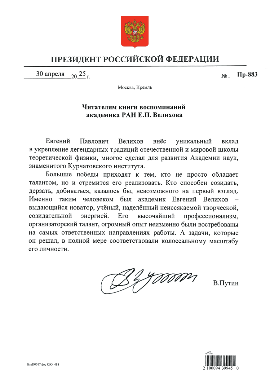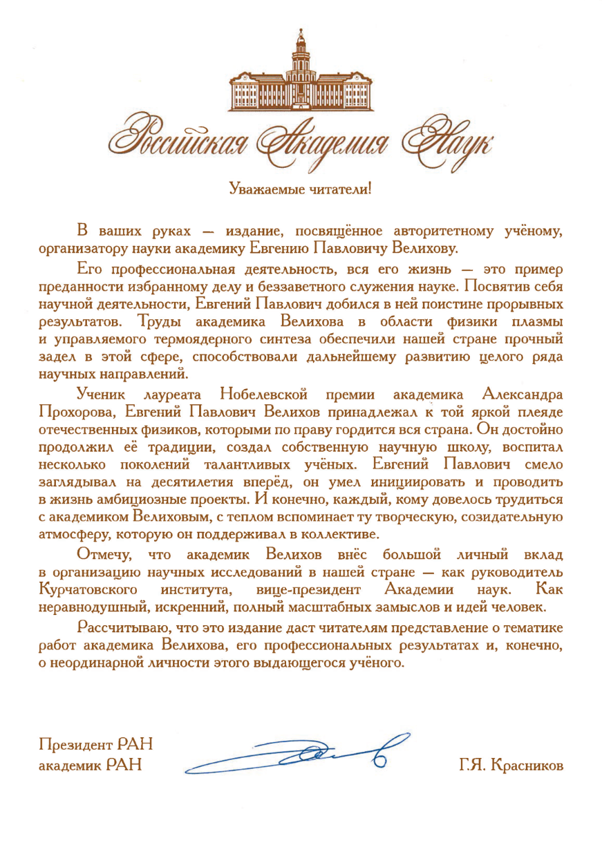 Семья Е. П. Велихова выражает искреннюю благодарностьвсем принимавшим участие в издании книги «Я на валенках поеду в 35-й год». Особую признательность адресуетпомощнику Президента России А. А. Фурсенкои президенту НИЦ «Курчатовский институт» М. В. Ковальчукуза личное участие в сохранении научногои общественного наследия Евгения Павловича
