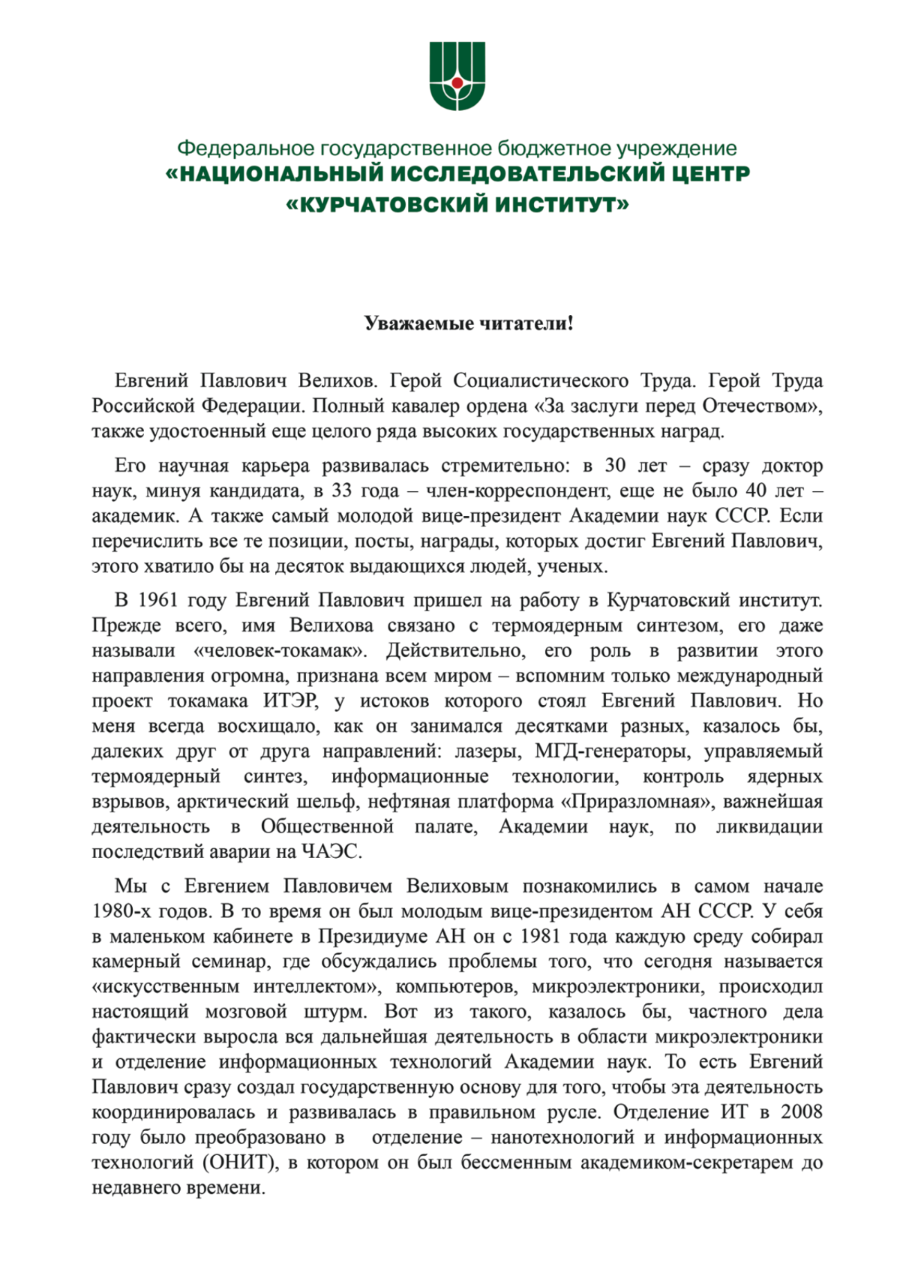 Воспоминания Академика Е. П. Велихова