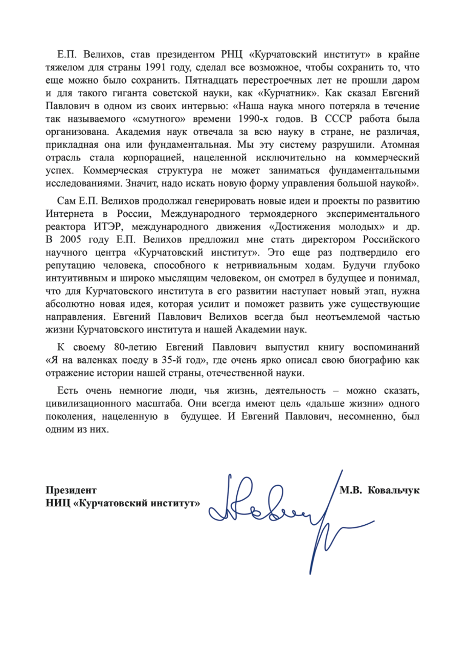 Евгений Павлович Велихов (1935–2024)