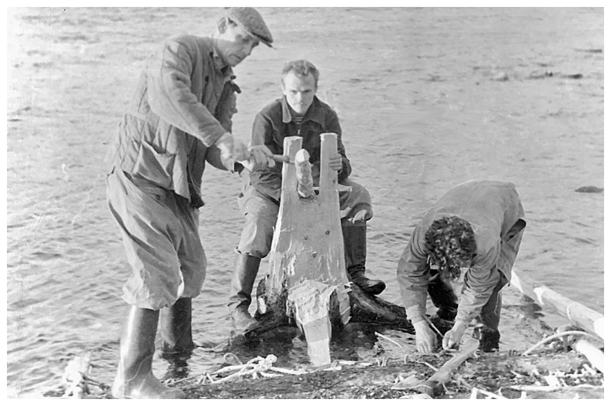 Евгений (в центре) строит плот для сплава по реке Сосьве