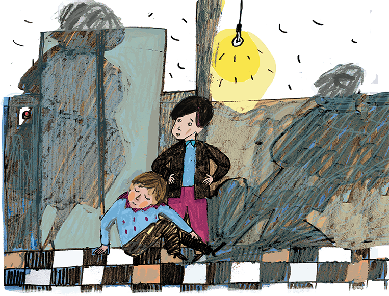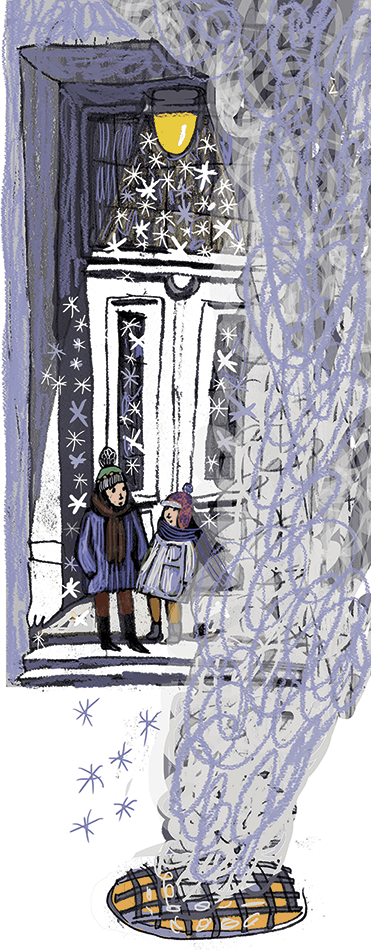 На улице было уже совсем темно. Фонари горели как-то слабо, освещая только кружащиеся вокруг них снежинки. До земли их свет, казалось, вообще не долетал. Где-то над головой каркали вороны. Лампочка над входной дверью светила на ступеньки, ведущие к тротуару, и на решётку у дома. Решётка, как всегда, слегка дымилась, но дым поднимался в темноту, и его почти не было видно. У папы в кармане зазвонил телефон. Он прижал его к уху и медленно пошёл вперед. Мальчики остановились на верхней ступеньке и переглянулись.