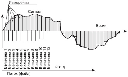Оцифровка сигнала заключается в том, что аналоговый сигнал разбивается на отдельные, очень короткие участки (дискретизация или выборка), и уровень сигнала на каждом участке измеряется и записывается в виде целого числа (квантование). Каждый «столбик» (рис. 1.5) изображает одно измерение.