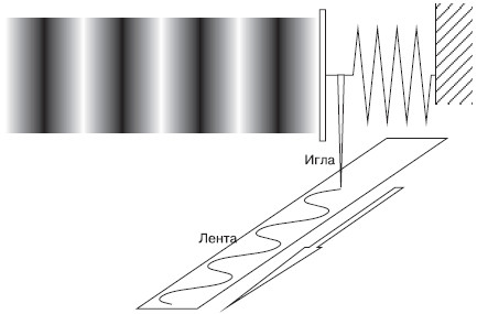 Если в воображаемом приборе, с помощью которого мы измеряли звуковое давление, вместо стрелки использовать острую иглу, а под этой иглой с постоянной скоростью протаскивать ленту, покрытую каким-нибудь мягким составом типа воска, то игла будет выцарапывать на нем извилистую бороздку – график изменения давления, или своеобразное графическое изображение звуковых колебаний, их временную развертку (рис. 1.2). Более того, если затем вновь провести иглой по бороздке, то мембрана начнет колебаться в соответствии с ее изгибами, и вы услышите звук. Именно так был устроен первый в истории звукозаписывающий аппарат – фонограф Эдисона. Только в нем звуковая дорожка процарапывалась на вращающемся валике, покрытом воском.
