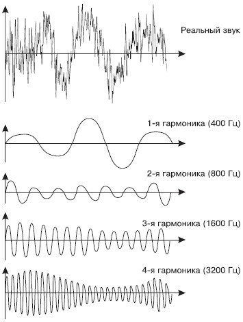Реальные звуки, вроде звучания музыкальных инструментов, голоса или шума, образуются сочетанием множества колебаний разных частот. Графическая развертка таких колебаний выглядит как кривая сложной формы (рис. 1.4).