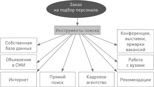 Основными инструментами поиска для рекрутера являются: собственная база данных потенциальных кандидатов, интернет-ресурсы, прямой поиск, поиск через рекомендации, работа с вузами с целью привлечения лучших студентов и выпускников, а также поиск через профессиональное агентство по подбору персонала. Со временем вы наверняка сможете вспомнить конкретных кандидатов, с которыми встречались ранее, и тем самым ускорите свой новый поиск. Вы можете также обратиться к коллегам или знакомым, являющимся экспертами в искомой области. Зачастую и сам линейный руководитель, будучи профессионалом в своей сфере, подскажет вам имена потенциальных кандидатов либо компаний, в которых такой человек может работать. С кем-то из потенциальных кандидатов вы можете познакомиться в социальных сетях, а также на публичных мероприятиях.