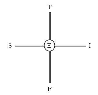 Расположим функции крестообразно (рис. 1). В центре поместим Эго (Е), которое обладает определенной энергией. Эта энергия и есть сила воли. В случае мыслительного типа эта сила может быть направлена к мышлению (Т). Тогда мы должны расположить чувства (F) внизу, под Т, поскольку в этом случае F – подчиненная функция. Это следует из того, что когда вы думаете, то должны исключить чувства, и наоборот. Когда вы думаете, оставьте ваши чувства и чувственные оценки. Чувства наиболее разрушительны для ваших мыслей. Эти две функции отрицают друг друга.
