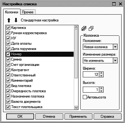 Окно списка содержит перечень соответствующих позиций (документов, организаций, контрагентов и др.). Для каждой позиции списка в соответствующих колонках показывается общая информация: дата и номер документа, контрагент по документу, сумма, вид операции и др. (это определяется конкретным режимом работы).
