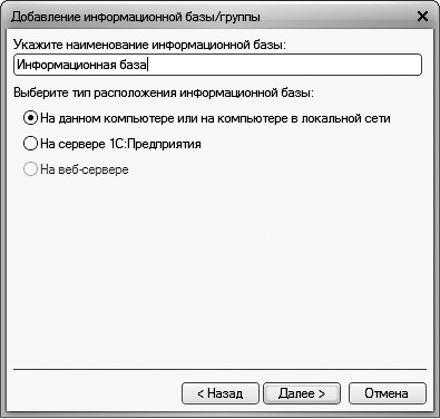 Для перехода к следующему этапу нажмите кнопку Далее. При создании новой информационной базы на экране отобразится окно, которое показано на рис. 1.6.