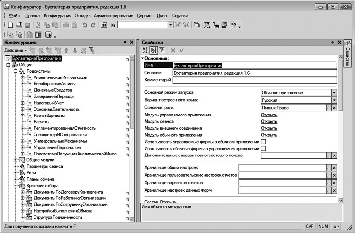Что касается режима «Конфигуратор» (рис. 1.2), то он предназначен для настройки и администрирования программы. Здесь создаются и редактируются объекты конфигурации, настраиваются интерфейсы и диалоговые окна, определяется вид и содержимое печатной формы документов, а также выполняются иные действия по настройке и конфигурированию системы. В большинстве случаев с «Конфигуратором» работает администратор либо другой уполномоченный специалист, поскольку это требует специфических знаний.