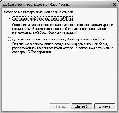 Чтобы приступить к эксплуатации программы, необходимо при ее первом запуске создать информационную базу, в которой будут храниться все данные и с которой будет вестись работа. Для перехода в режим создания информационной базы необходимо в окне запуска программы (см. рис. 1.4) нажать кнопку Добавить — в результате откроется окно, изображенное на рис. 1.5.