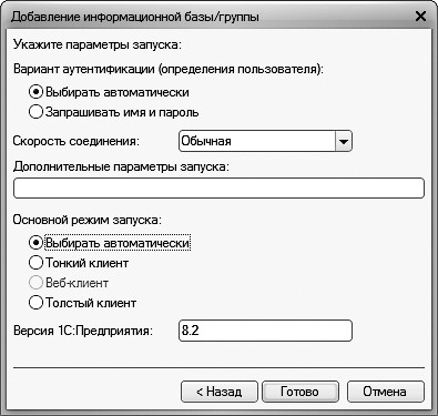 В данном окне можно указать дополнительные параметры запуска информационной базы. Если особых пожеланий по запуску информационной базы нет, можно оставить значения, предлагаемые по умолчанию.