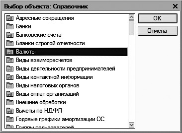 Выбор объектов для дальнейшей работы осуществляется в интерфейсах выбора или списка. Например, для перехода в режим работы с каким-либо справочником необходимо выбрать его в окне выбора (рис. 1.11), которое вызывается на экран с помощью команды главного меню ОперацииСправочники.