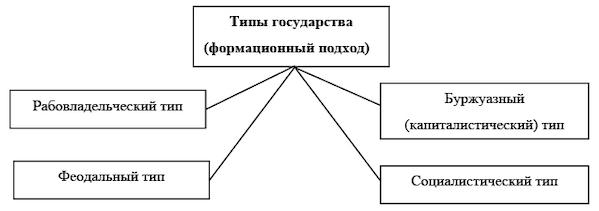 Формационный подход. Представителями данного подхода выступают К. Маркс, Ф. Энгельс, В. И. Ленин, И. В. Сталин и др. Формация представляет собой определенную ступень в развитии общества, которая отличается особым способом производства. Таким образом, важнейшим классификационным критерием в данном подходе выступают особенности экономических отношений (способа производства), свойственных для конкретной ступени развития общества. Различают пять формаций (ступеней развития) общества: первобытно-общинная, рабовладельческая, феодальная, капиталистическая и социалистическая. Каждой формации (кроме первобытно-общинной) соответствует свой тип государства. Примеры таких типов государства представлены на рисунке 6.
