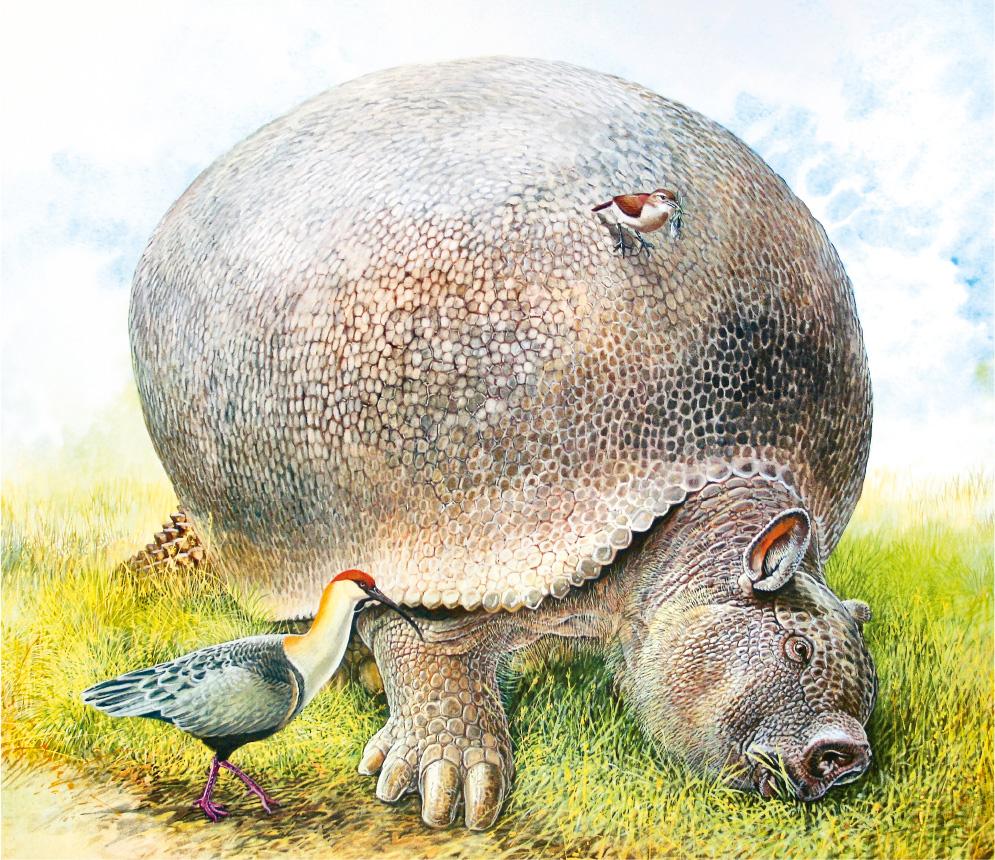 Глиптодон (Glyptodon clavipes) из Южной Америки. Птицы — рыжий печник, сидящий на панцире (Furnarius rufus), и белошейный ибис (Theristicus caudatus) — относятся к видам, дожившим до наших дней