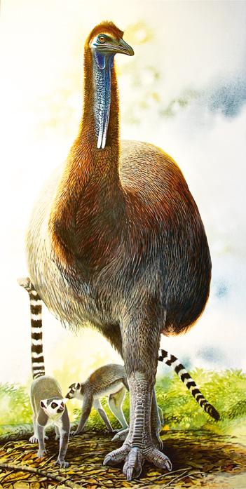 ИЛЛ. 1.1. ТЫСЯЧУ ЛЕТ НАЗАД НА ЮГЕ МАДАГАСКАРА. МАДАГАСКАРСКИЙ ЭПИОРНИС (Aepyornis maximus) идет мимо пары кошачьих лемуров (Lemur catta — вид, сохранившийся до наших дней). Птица весила, возможно, до 230 кг, а ее яйца были до 1 м в окружности. Не полностью окаменевшие остатки эпиорниса и его близкого родственника мюллерорниса (Mullerornis) (см. илл. 4.8) встречаются часто, следовательно, эти птицы были, вероятно, достаточно многочисленны. Некоторые пляжи на Мадагаскаре усеяны осколками скорлупы их яиц, это определенно означает, что эти птицы там гнездились. Возможно, эпиорнисы прожили достаточно долго, чтобы их образ, хоть и в очень искаженной форме, лег в основу легенды о птице Рух — сказку об этом диковинном существе Марко Поло привез в Европу в начале XIV в.