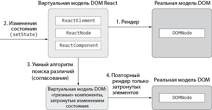 • React для веб-приложений включает библиотеки React Core и ReactDOM. Библиотека React Core ориентирована на единообразие построения и совместного использования композитных UI-компонентов, использующих JavaScript и (не обязательно) JSX. С другой стороны, чтобы работать с React в браузере, можно использовать библиотеку ReactDOM, которая содержит методы для рендеринга DOM, а также рендеринга на стороне сервера.