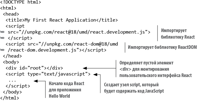 Разметка index.html очень проста. Она начинается с включения библиотек в <head>. В элементе <body> создается контейнер <div> с идентификатором root и элементом <script> (в котором позднее будет размещен код приложения), как показано в листинге 1.1.