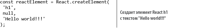 Включая библиотеки в файл HTML, вы получаете доступ к глобальным объектам React и ReactDOM: window.React и window.ReactDOM. Вам понадобятся два метода этих объектов: для создания элемента (React) и для рендера его в контейнере <div> (ReactDOM), как показано в листинге 1.2. Чтобы создать элемент React, достаточно вызвать React.createElement(elementName, data, children) с тремя аргументами: