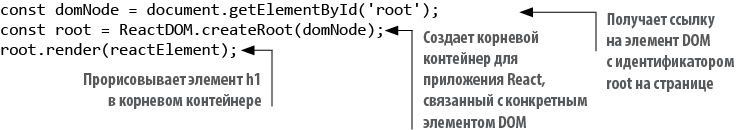 После того как элемент будет создан и сохранен в переменной, создается контейнер приложения React (с именем root) на основе элемента DOM при помощи метода ReactDOM.createRoot(). Наконец, элемент React рендерится в корне при помощи метода root.render(), как показано в листинге 1.2.
