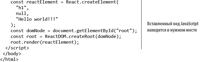 Код JavaScript можно абстрагировать в отдельный файл, а не включать сценарий напрямую в файл HTML (см. листинг 1.1). Например, можно создать файл с именем script.js, а затем скопировать в него весь код из листинга 1.2 или 1.3. Затем в файле HTML необходимо добавить ссылку на файл script.js после <div id="root">, не включая сам сценарий: