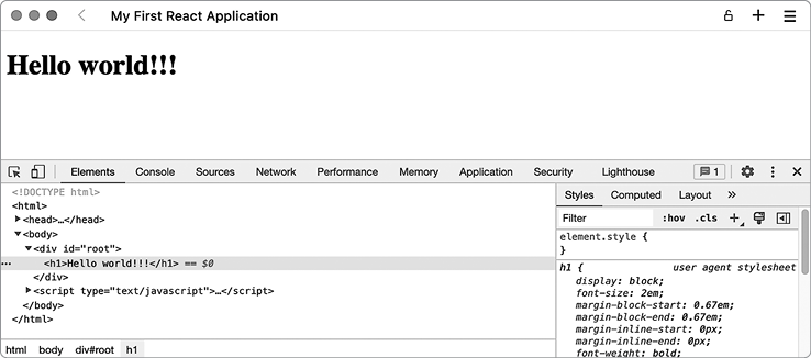 На рис. 1.6 изображена вкладка Elements в инструментах разработчика в браузере с выбранным элементом <h1>. Вы понимаете, что React что-то изменил, потому что в исходном файле HTML в корневом узле не было элемента <h1> — он был пустым.