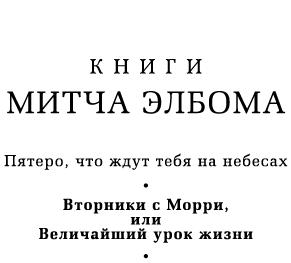 Митч Элбом (р. 1958) — известный американский писатель, журналист, сценарист, драматург, радио- и телеведущий и музыкант, чьи книги проданы тиражом более 39 миллионов экземпляров по всему миру. «Вторники с Морри» (1997) — книга, представляющая собой хронику еженедельных встреч автора со своим бывшим преподавателем социологии, 78-летним Морри Шварцем, умирающим от неизлечимой болезни. Каждый вторник Митч приезжал из Мичигана в Массачусетс и вел с Морри обстоятельные беседы о жизни и смерти, о любви и дружбе, об истинных и ложных ценностях. Пытаясь найти способ оплатить медицинские счета Морри, Митч решил выпустить книгу, рассказывающую об этих встречах. Опубликованные поначалу небольшим тиражом, «Вторники...» благодаря упоминанию в шоу Опры Уинфри вошли в список бестселлеров «Нью-Йорк таймс», а затем надолго заняли в нем верхнюю строчку. Неоднократно переизданная и переведенная более чем на 40 языков, книга Элбома в 1999 году стала литературной основой одноименного фильма с Джеком Леммоном в роли Морри (премия «Эмми») и Хэнком Азариа в роли Митча.