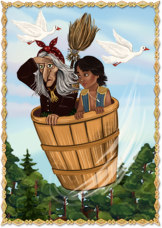 Немного поразмыслив, колдунья плюнула и велела ему забраться в ступу, затем ловко влезла туда сама, накинула на метлу волшебные колокольчики — и они вихрем вылетели из дома на чудо-изобретении.