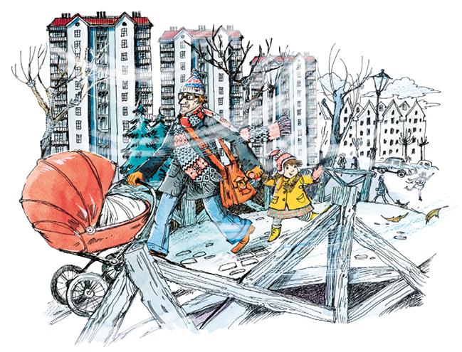 Когда дома были готовы, из города приехали люди и поселились в них. Эти люди вели себя совсем не так, как те, что рубили лес и строили дома. Каждое утро они торопливо выходили из подъездов, садились в автомобили и уезжали в город на работу. А те, у кого не было автомобилей, шли на трамвайную остановку.