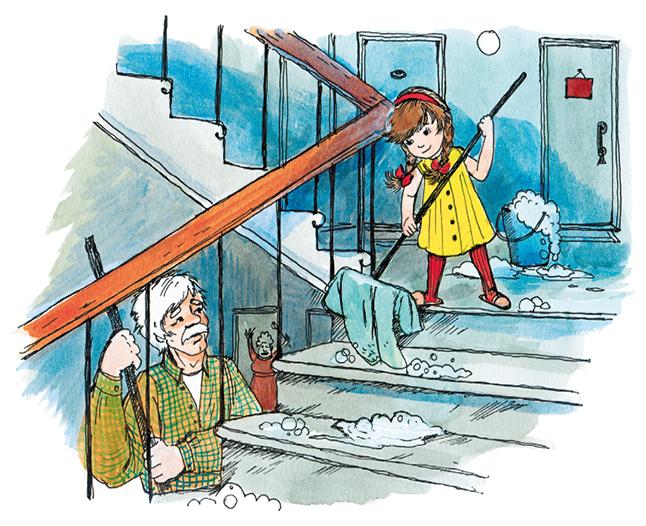 – Я вижу, ты не пожалела мыльного порошка, – сказал он. – Знаешь что? Я сейчас принесу чистой воды и сполосну все ступеньки, которые ты уже вымыла. А то ещё кто-нибудь упадёт, и тебе больше никогда не разрешат мыть лестницу.