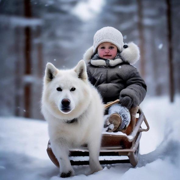 Мишка даже мог на нём кататься, усевшись верхом, как на лошадь, а зимой Снежок катал Мишку на санках.