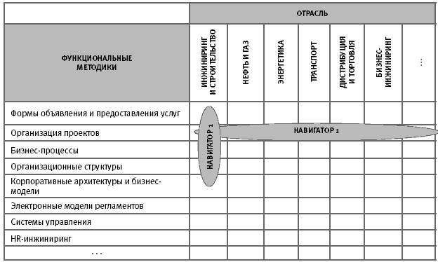 Навигатор – это и вся серия в целом, построенная в соответствии с едиными навигационными принципами. Навигатор – это и каждая книга серии (модуль), локализующая ту или иную тему. И наконец, навигатор – это отдельно взятый конечный элемент книги (разворот) – самодостаточный информационный носитель, снабженный системой операционных и тематических координат, позволяющий читателю не забывать, на какой широте и долготе единого информационного поля экономики он в данный момент находится. Это поле можно представить в виде таблицы (рис. 0.0.3.), в которой столбцам соответствуют отраслевые практики, строкам – функциональные методики. При этом базовой, отражающей общие для модульной программы принципы организации, универсальные структурообразующие и методологические модели бизнеса, является настольная книга руководителя «7 нот менеджмента» (изд. 6-е переработанное и дополненное). Для удобства обложкам книг серии присвоен индивидуальный цветовой акцент.