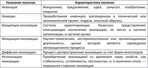 Рассмотрим основные понятия инновационного процесса, которые приведены в таблице 1.1[19]. Эти понятия являются основными элементами инновационного процесса. В связи с возрастающей каждый день конкуренцией руководителю необходимо постоянно владеть информацией о состоянии данных элементов. Трудности в реализации инновационного процесса могут возникнуть на любом его этапе.