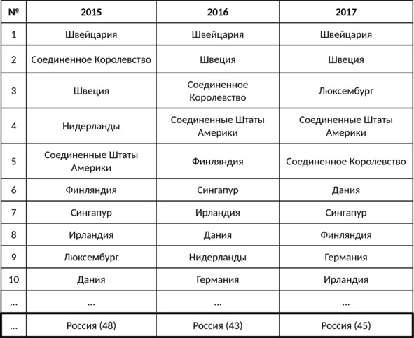 Сейчас одной из актуальных задач является развитие инновационной деятельности в экономике. Россия в этом вопросе значительно отстает от ведущих стран. Согласно докладу «Глобальный инновационный индекс», рейтинг ведущих стран за 2015–2017 годы выглядит следующим образом (табл. 1.3).