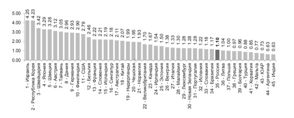 Данный индекс показывает соотношение затрат и эффекта, что позволяет оценить эффективность усилий по развитию инноваций в той или иной стране. Как видно из таблицы, рейтинг Российской Федерации колеблется между 41 и 49 местом. Значение данного индекса зависит от субиндекса инновационных затрат, позволяющего оценивать элементы национальной экономики, в которых протекают инновационные процессы (институты, инфраструктура, человеческий капитал и исследования, уровень знаний рынка и уровень развития бизнеса).