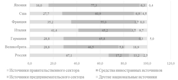 Структура внутренних затрат на исследования и разработки в России также отличается от ведущих стран, основным источником финансирования исследований и разработок в России выступает государство, в то время как зарубежные страны используют средства иностранных источников (рис. 1.3).