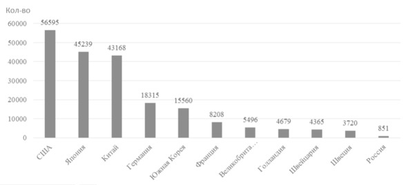 По числу поданных патентных заявок во всемирную организацию интеллектуальной собственности Россия значительно отстает от развитых стран (рис. 1.4). Это говорит о низкой производительности труда научных работников и недостаточной наукоотдаче для мирового рынка, а также слабой вовлеченности в мировой инновационный процесс, так как, по данным статистического ежегодника России, в 2016 году в Роспатент было подано 58 163 заявки из которых было выдано 46 866 патентов, что сравнимо с количеством поданных патентных заявок у США.