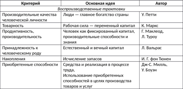 Проведя обзор социально-экономических исследований, посвященных этому вопросу, можно сделать вывод о том, что и по сегодняшний день не существует ясного представления о путях и механизмах развития человеческого капитала в социально-экономической системе страны. Что касается определения человеческого капитала, то оно довольно размыто, нет системного видения проблемы, отсутствует четкая структура элементов его воспроизводства (табл. 1.4).