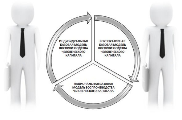 Ранее мы уже отмечали, что воспроизводство человеческого капитала является одной из важнейших задач страны вне зависимости от ее политического и экономического устройства. И среди всего многообразия моделей воспроизводства человеческого капитала можно выделить следующие базовые модели: индивидуальную, корпоративную и национальную (рис. 1.6).