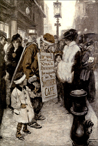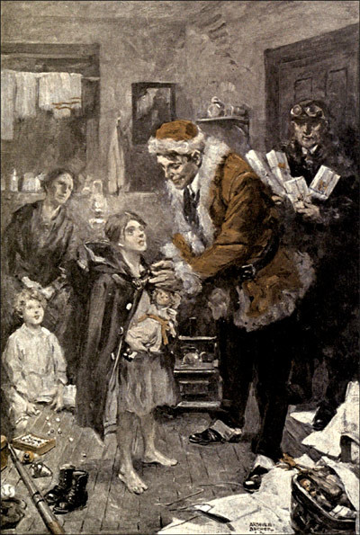 The exchange of externals was not long in accomplishment. The gathering of the shadows of night made it a comparatively easy matter to arrange behind a conveniently stalled and heavily laden express wagon hard by, and in a few moments the irascible but still "sporty" Hetherington, who from childhood up to the present had never been able to take a dare, found himself banging away on a tambourine and incidentally shivering in the poor red habiliments of a fraudulent Saint. For a half-hour the novelty of his position gave him a certain thrill, and no Santa Claus in town that night fulfilled his duties more vociferously than did Hetherington; but as time passed on, and the chill of a windy corner began to penetrate his bones, to say nothing of the frosty condition of his ears, which his false cotton whiskers but indifferently protected, he began to tire of his bargain.