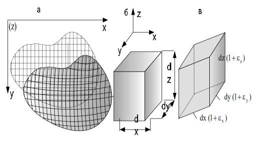 До нагружения, как уже указывалось, длины ребер параллелепипеда равны dх, dу и dz (рис. 4.2, б). После нагружения, а также в результате изменения температуры длины ребер изменились на величины